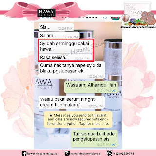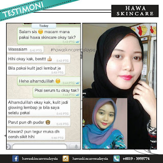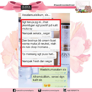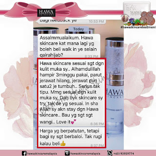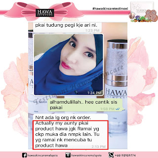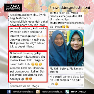 "Setiap hari selfie, mesti ada yg komen dkt post sy guna apa. Jalan2 pergi mall, terserempak member pun asyik tanya je guna ape. Terasa mcam artis pulak. hihi Kalau jumpa Hawa Skincare ni dari awal mesti saya dah cantik! TQ sis perkenalkan saya dgn produk terbaik abad ni!"